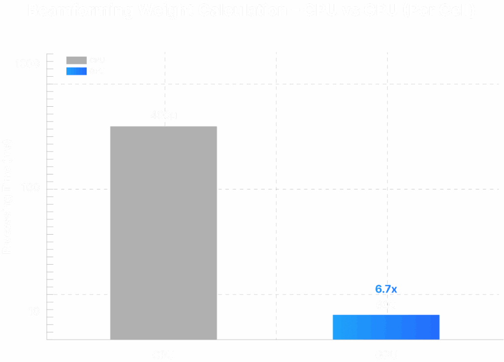 Beamforming speedups on GPU (~6.7×) allow the DU to run more advanced precoding and multicell coordination without missing deadlines.