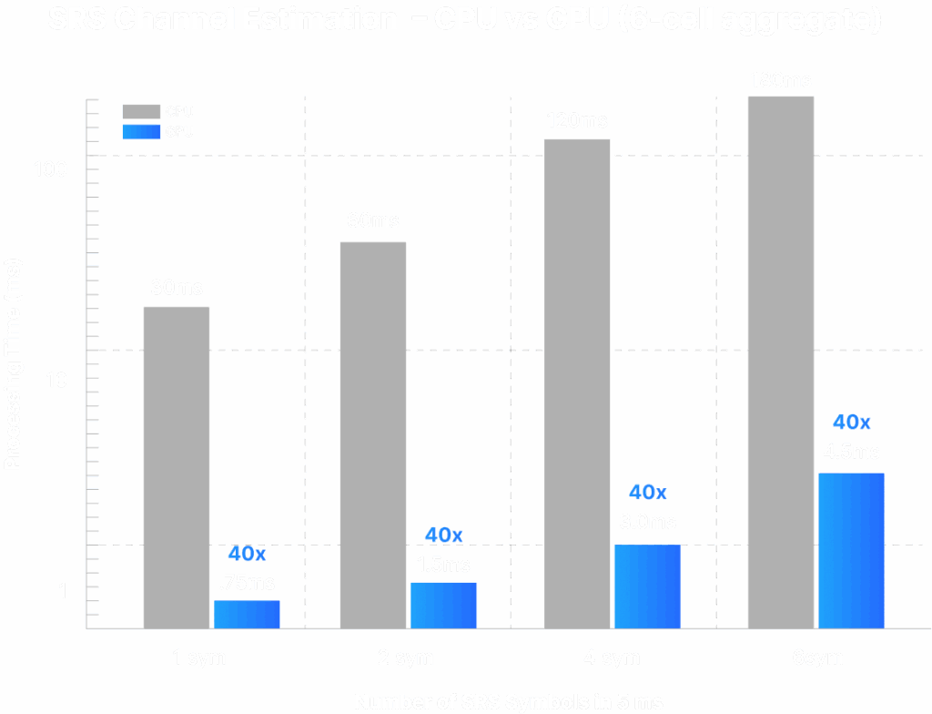 | SRS Channel Estimation (6 symbols, 6 cells) | 180 ms | 4.5 ms | Timely CSI; Denser MU-MIMO |